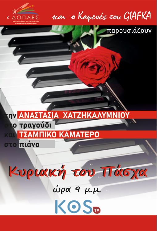 Μουσική βραδιά με τίτλο «΄0πως παλιά…» με έντεχνα και λαϊκά τραγούδια με την Αναστασία Χατζηκαλύμνιου στο τραγούδι και τον Τσαμπίκο Καματερό στο πιάνο διοργανώνει το Τμήμα Πολιτισμού του ΔΟΠΑΒΣ και η εκπομπή Ο καφενές του GIAFKA.