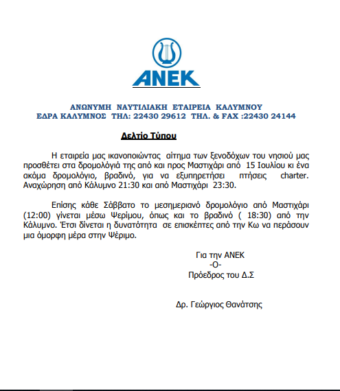 Με αναχώρηση στις 21:30 από Κάλυμνο και στις 23:30 από Μαστιχάρι θα εξυπηρετούνται οι επιβάτες πτήσεων charter, σύμφωνα με αίτημα των ξενοδόχων, ενώ η ΑΝΕΚ θα προσεγγίζει και την Ψέριμο, με δύο δρομολόγια κάθε Σάββατο (12:00 από Μαστιχάρι και 18:30 από Κάλυμνο), ενισχύοντας την μετακίνηση επισκεπτών στο νησί της Ψερίμου.