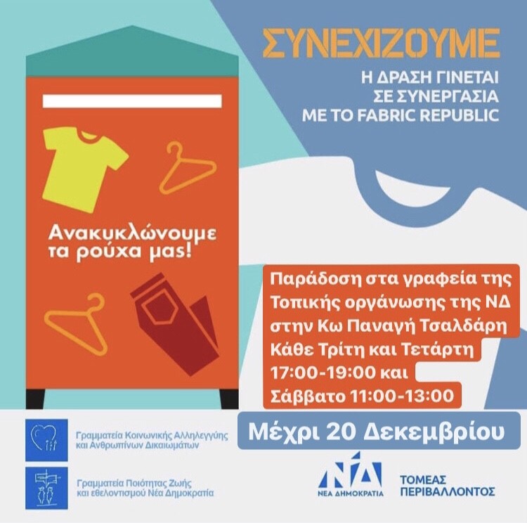 Η ΔΗΜ. ΤΟ  της ΝΔ ΚΩ συμμετέχει στη δράση με την ανακύκλωση ρούχων, την οποία διοργανώνουν η Γραμματεία Κοινωνικής Αλληλεγγύης &Ανθρωπίνων Δικαιωμάτων και η Γραμματεία Ποιότητας Ζωής & Εθελοντισμού της Κεντρικής Οργάνωσης ΝΔ . Η Δράση αυτή γίνεται σε συνεργασία με τοFABRICREPUBLIC.