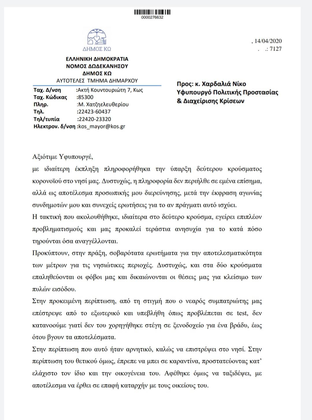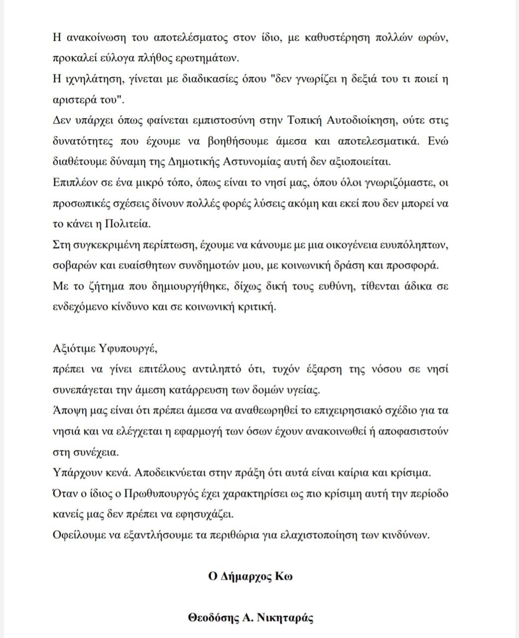 Όσον αφορά στην εμφάνιση 2ου κρούσματος, που εισήχθη και αυτό στην Κω μέσω αεροδρομίου, το πληροφορήθηκα με ανεπίσημο τρόπο, δίχως να γνωρίζει κανένας στην Κω τι γίνεται. Καμία ενημέρωση από πουθενά.