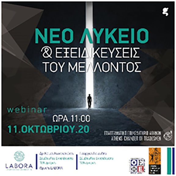 Με την έναρξη της σχολικής χρονιάς, η Ομοσπονδία Εκπαιδευτικών Φροντιστών Ελλάδος -ΟΕΦΕ και ο Σύλλογος Εκπαιδευτικών Φροντιστών Αττικής – ΣΕΦΑ με την αρωγή του Επαγγελματικού Επιμελητηρίου Αθηνών-ΕΕΑ διοργανώνει διαδικτυακό σεμινάριο με τίτλο: «ΝΕΟ ΛΥΚΕΙΟ & ΕΞΕΙΔΙΚΕΥΣΕΙΣ ΤΟΥ ΜΕΛΛΟΝΤΟΣ» σε συνεργασία με την επιστημονική ομάδα της LABORA-Σύμβουλοι Εκπαίδευσης και ομιλητές τον Δρ. Κωνσταντίνο Κότιο, Σύμβουλο Εκπαίδευσης και Καριέρας, Ιδρυτή LABORA και τον κ. Γεώργιο Γατούδη, Σύμβουλο Εκπαίδευσης και Καριέρας, Επιστημονικό Υπεύθυνο Εκπαιδευτικών Προγραμμάτων LABORA.