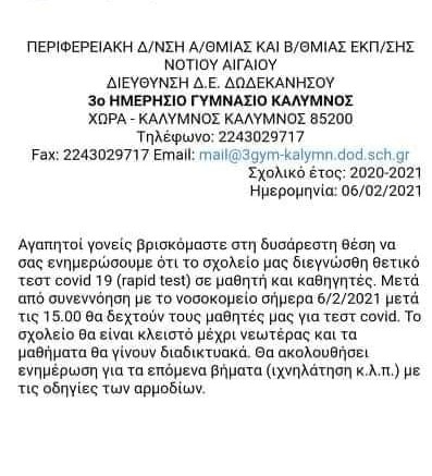 Αυτό που είχε προαναγγείλει χθες ο "Π.τ.Κ.", ότι ενδέχεται να κλείσουν σχολικές μονάδες στην Κάλυμνο, ανακοινώθηκε σήμερα καθώς πως κλείνει το 3ο Γυμνάσιο Χώρας, λόγω κρουσμάτων σε μαθητές και εκπαιδευτικούς, ενώ σήμερα διαγνώσθηκαν άλλα 6 κρούσματα θετικά στον covid-19, με την διασπορά να είναι πλέον ανησυχητική και τα θετικά κρούσματα να ξεπερνούν τα 20.