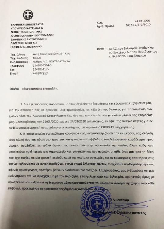 Ακολουθεί συνημμένα, η ευχαριστήρια επιστολή του Λιμενάρχη Κω, κ.Χαμέτη Παντελή.