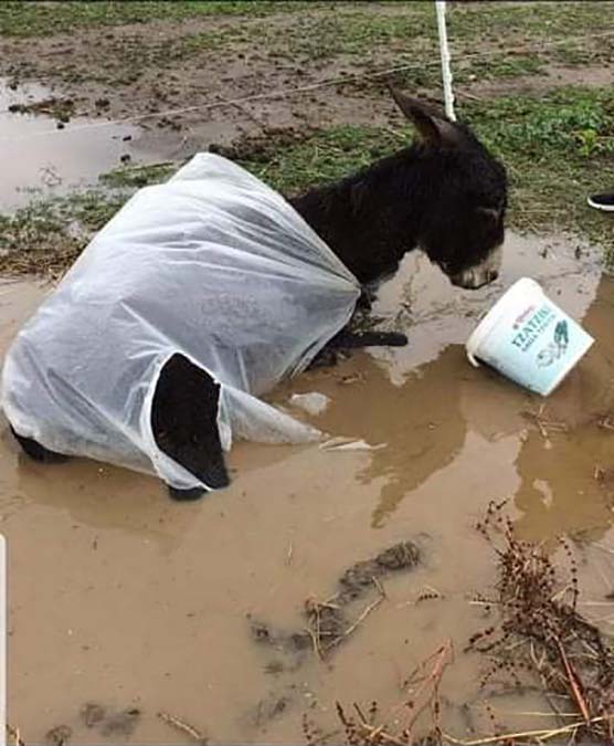 Μάλιστα το γαϊδουράκι ήταν πεσμένο μέσα στα νερά άγνωστο για πόσες ημέρες και φορούσε ένα πλαστικό κάλυμμα. Όπως μας είχαν αναφέρει οι άνθρωποι που το βοήθησαν είχε πληγές ανοικτές από τα σχοινιά, πυρετό και υποθερμία εξαιτίας της πολύωρης παραμονής στα παγωμένα νερά.