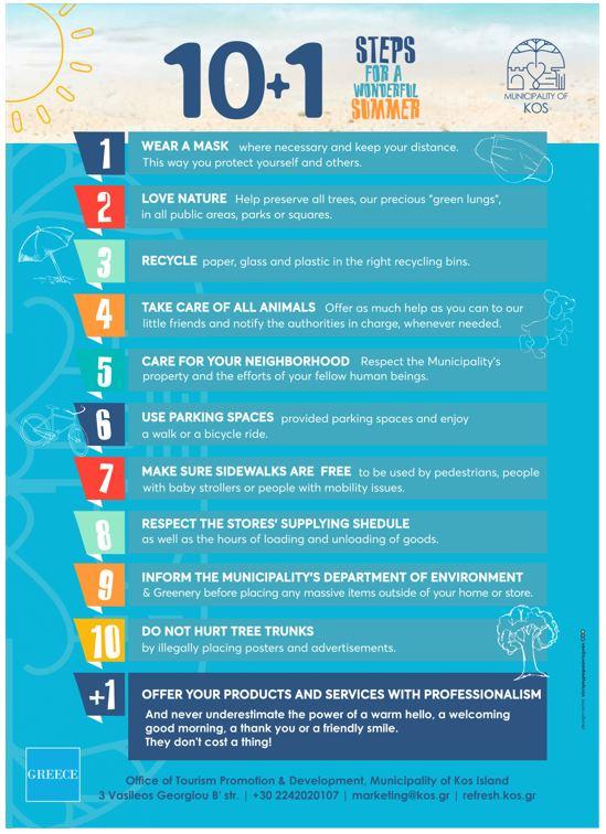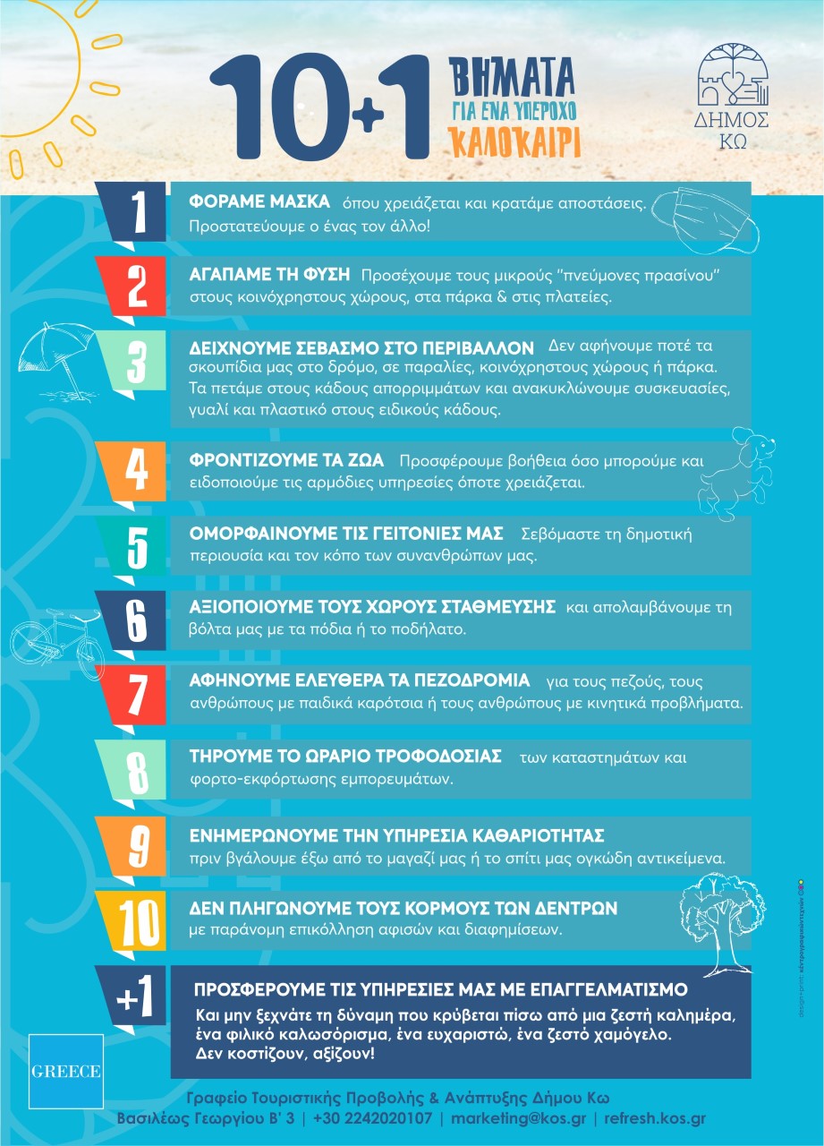 ΚΑΙ επειδή τουρισμός είμαστε όλοι ας θυμηθούμε μερικές απλές αλλαγές στην καθημερινή συμπεριφορά μας για μια καλύτερη τουριστική Κω μέσα από ένα ενημερωτικό φυλλάδιο που εξέδωσε το Γραφείο Τουριστικής Προβολής και Ανάπτυξης με θέμα: Ακολουθώ τα 10 + 1 Βήματα για ένα υπέροχο καλοκαίρι και στόχο την ενδυνάμωση της τουριστικής μας συνείδησης.