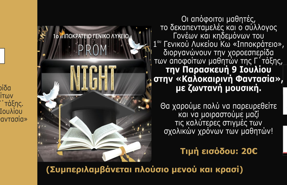 Οι απόφοιτοι μαθητές, το δεκαπενταμελές και ο σύλλογος Γονέων και κηδεμόνων του 1ου Γενικού Λυκείου Κω «Ιπποκράτειο», διοργανώνουν την χοροεσπερίδα των αποφοίτων μαθητών της Γ΄τάξης, την Παρασκευή 9 Ιουλίου στην «Καλοκαιρινή Φαντασία», με ζωντανή μουσική.