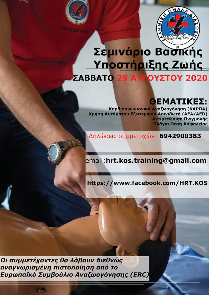 Η Ελληνική Ομάδα Διάσωσης Κω θα πραγματοποιήσει Πιστοποιημένο σεμινάριο Βασικής Υποστήριξης Ζωής (BLS/AED), το Σάββατο 29 Αυγούστου 2020.