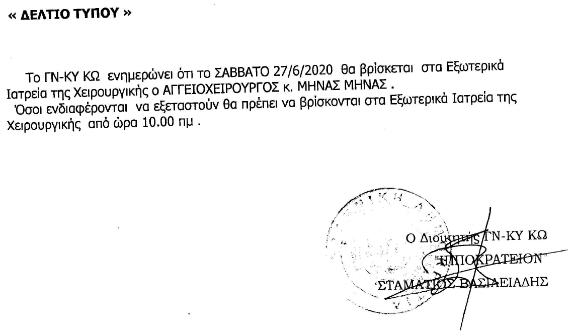 Στο νοσοκομείο της Κω, το Σάββατο 27 Ιουνίου, ο αγγειοχειρουργός κ. Μηνάς Μηνάς