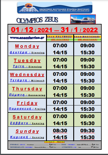 Τα δρομολόγια του πλοίου “Ολύμπιος Ζευς” της ΑΝΕΜ (Ανώνυμη Ναυτιλιακή Εταιρία Μαστιχαρίου) για την περίοδο από 1η Δεκεμβρίου 2021 μέχρι 31 Ιανουαρίου 2022, στη γραμμή Κάλυμνος – Μαστιχάρι, όπως ανακοινώθηκαν από την εταιρεία, είναι τα παρακάτω: