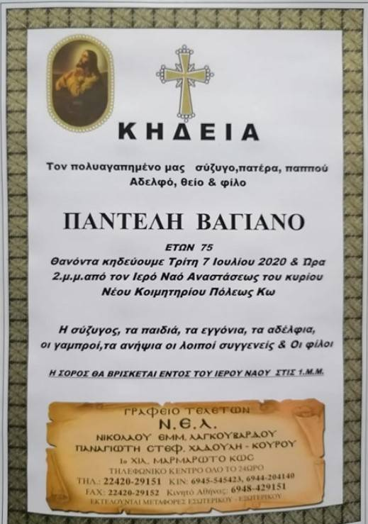 Αύριο Τρίτη 7 Ιουλίου 2020 στις 2.00 το μεσημέρι στον Ιερό ναό Αναστάσεως του Κυρίου στο νέο κοιμητήριο Κω θα τελεστεί η εξόδιος ακολουθία για τον Παντελή(Λάκη) Βαγιανό