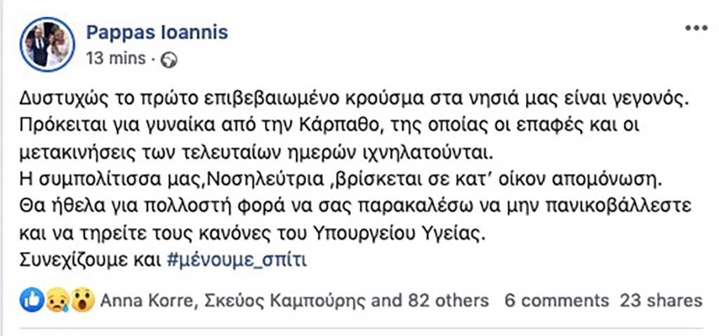 «Δυστυχώς το πρώτο επιβεβαιωμένο κρούσμα στα νησιά μας είναι γεγονός. Πρόκειται για γυναίκα από την Κάρπαθο, της οποίας οι επαφές και οι μετακινήσεις των τελευταίων ημερών ιχνηλατούνται.