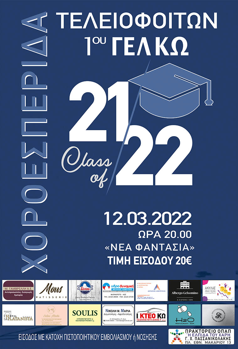 Ο σύλλογος Γονέων και κηδεμόνων, οι τελειόφοιτοι μαθητές και το δεκαπενταμελές, του 1ου Γενικού Λυκείου Κω «Ιπποκράτειο», σας προσκαλούν στην χοροεσπερίδα των μαθητών της Γ΄τάξης, το Σάββατο 12 Μαρτίου 2022, στις 20:00 στην «Νέα Φαντασία», με ζωντανή μουσική.