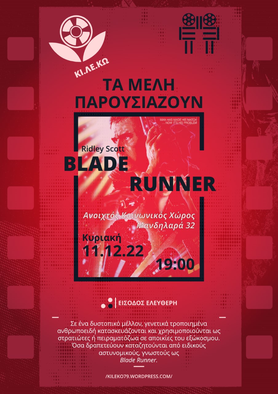 H ΚΙ.ΛΕ.ΚΩ σας προσκαλεί και πάλι στη δράση προβολών Τα μέλη παρουσιάζουν, στον φιλόξενο Ανοιχτό Κοινωνικό Χώρο Μανδηλαρά 32, όπου κάθε μέλος έχει την ευκαιρία να παρουσιάσει και να ανοίξει συζήτηση για μια αγαπημένη του ταινία, μοιράζοντας έτσι τις εμπειρίες, τις σκέψεις και τα συναισθήματά του με όλους εμάς. Συνεχίζουμε την Κυριακή 11/12 στις 19:00, με την κλασική ταινία επιστημονικής φαντασίας Blade Runner.