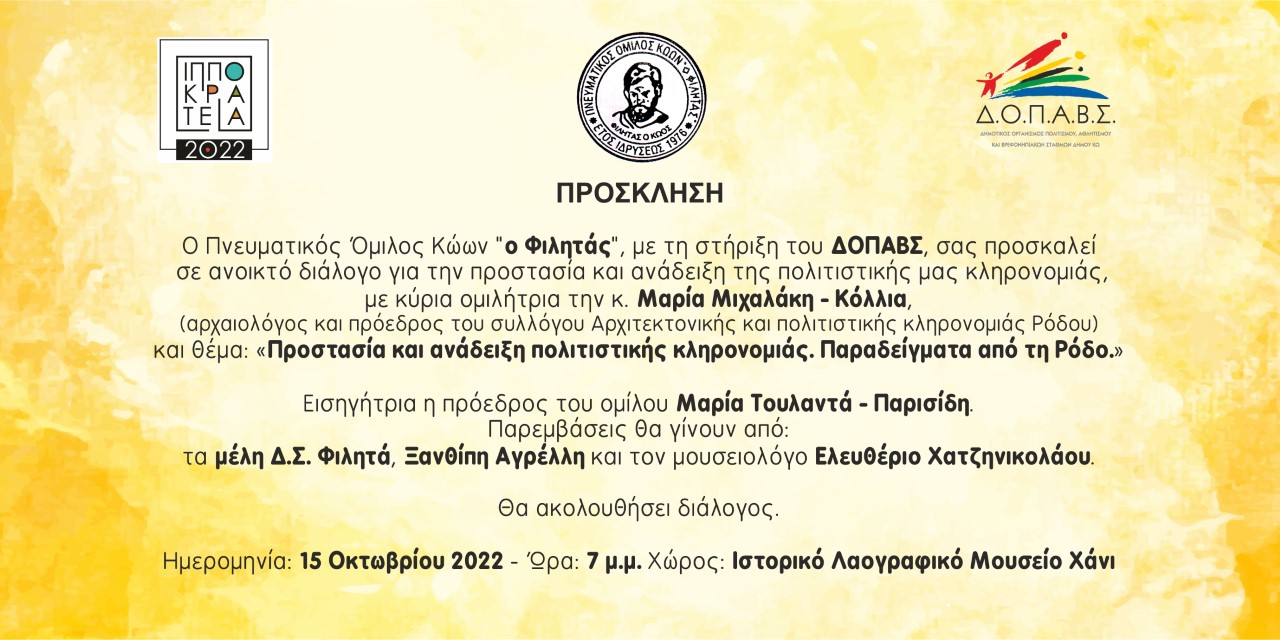 O Πνευματικός όμιλος Κώων «Ο Φιλητάς» με την στήριξη του ΔΟΠΑΒΣ διοργανώνει ανοικτό διάλογο για την προστασία και ανάδειξη της πολιτιστικής μας κληρονομιάς, το Σάββατο 15 Οκτωβρίου στο Ιστορικό Λαογραφικό Μουσείο-Χάνι στις 19:00