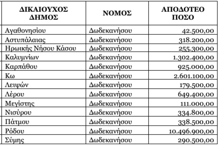Ποσό 18,5 εκατομμυρίων ευρώ από τους Κεντρικούς Αυτοτελείς Πόρους (του 2022) κατανέμεται στους δήμους της Δωδεκανήσου.
