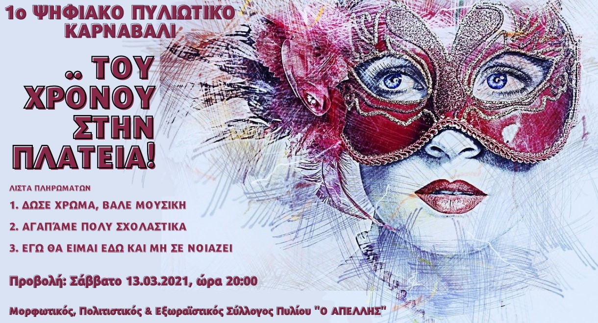 Υπό την πίεση της πανδημίας και των μέτρων πρόληψης της διασποράς του covid-19, σχεδιάσαμε μια ψηφιακή καρναβαλική δράση, που αφορά το σύνολο των μελών μας κάθε ηλικίας, τους συμπολίτες μας, αλλά και όσους ακόμα μπορεί να θελήσουν να συμμετάσχουν και δε ζουν στο νησί μας. Ένα καρναβαλικό δρώμενο που δυστυχώς φέτος όσοι επιθυμούν, θα συμμετέχουν από μακριά. Όμως, αξιοποιώντας το διαδίκτυο και τα ηλεκτρονικά μέσα, μπορεί να απλωθεί παντού!