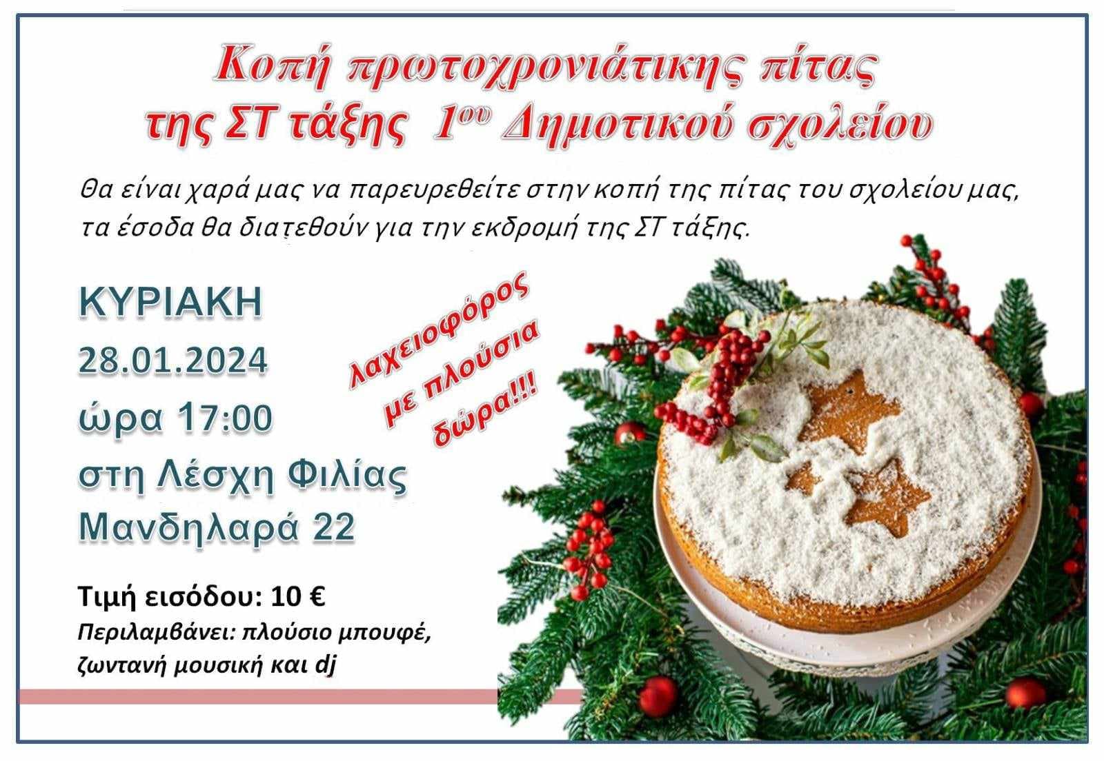 Την Κυριακή στις 28/01/2024 και ώρα 17:00 μ.μ. θα πραγματοποιηθεί η κοπή της πρωτοχρονιάτικης πίτας της ΣΤ' τάξης του 1ου Δημοτικού Σχολείου Κω.