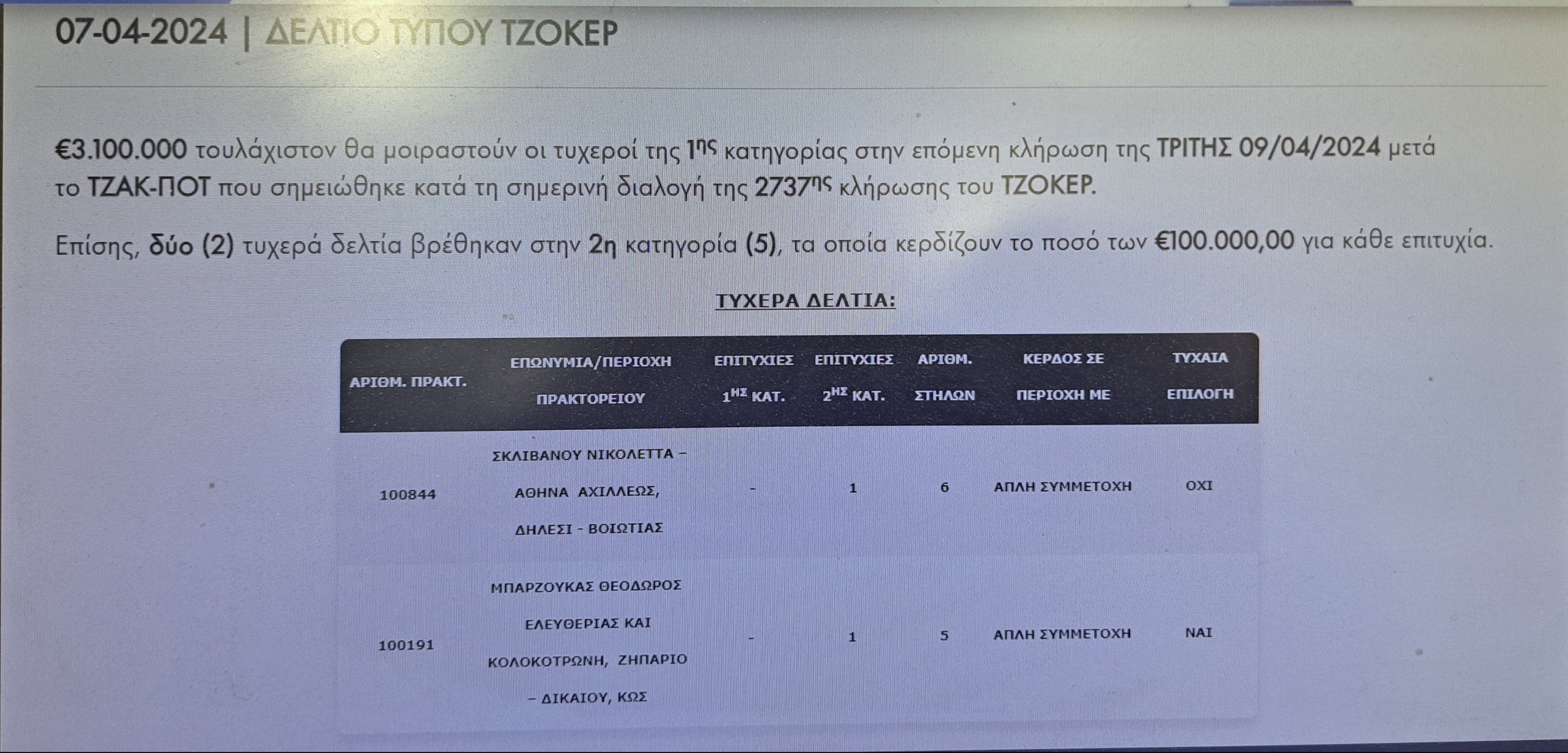 Και 5αρι στο Τζόκερ (100.000€) στην κλήρωση της Κυριακής 7/4, στο πρακτορείο του Θ. Μπαρζούκα.