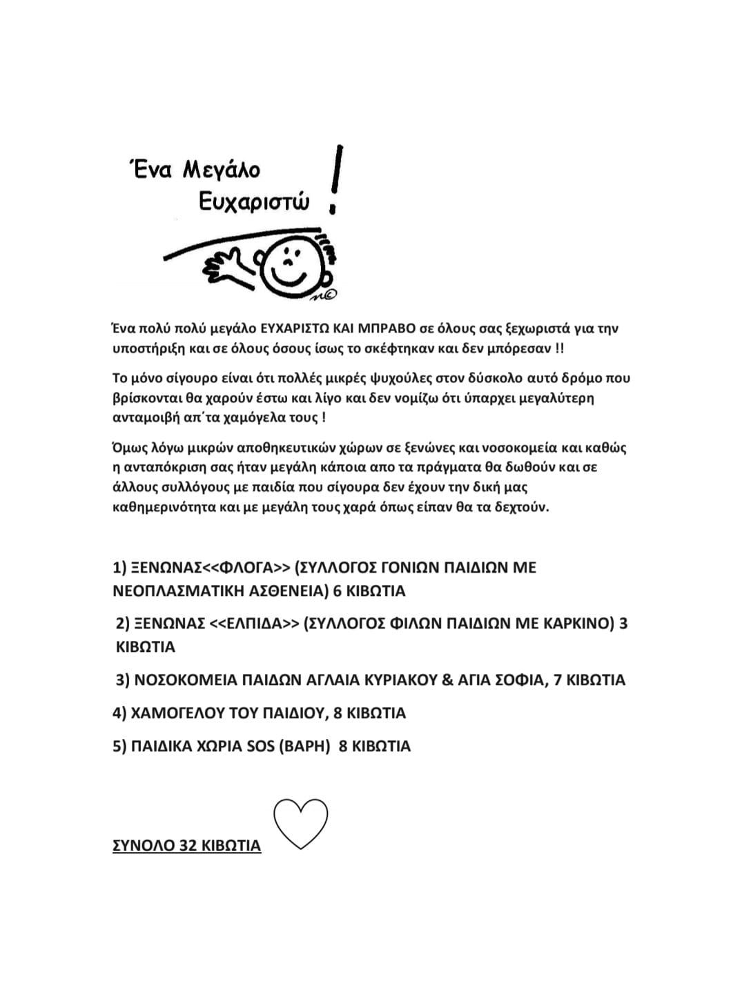 Συνολικά συγκεντρώθηκαν 32 κιβώτια, με την κ. Καλσάτου να ευχαριστεί τους Κώους για την μεγάλη ανταπόκρισή τους: