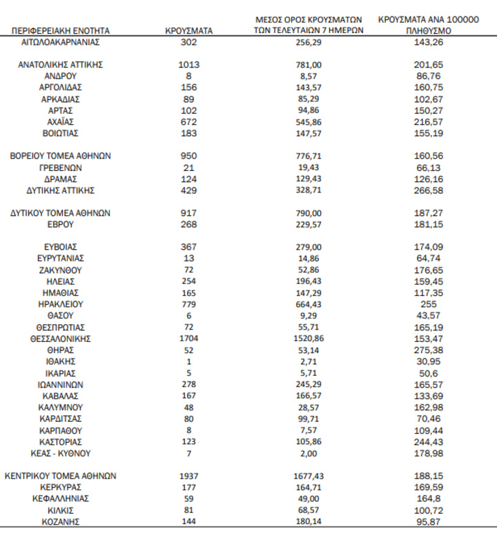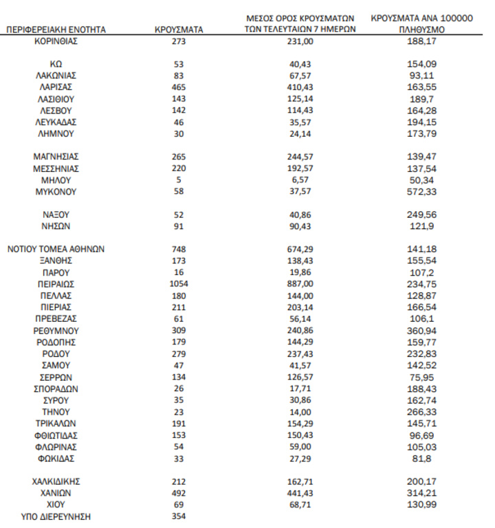 Με βάση τα επιβεβαιωμένα κρούσματα των τελευταίων 7 ημερών, 446 θεωρούνται σχετιζόμενα με ταξίδι από το εξωτερικό και 2.489 είναι σχετιζόμενα με ήδη γνωστό κρούσμα.