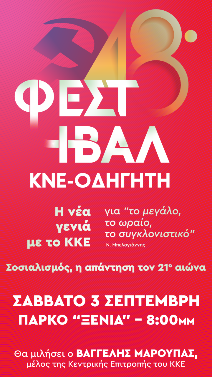 «Η νέα γενιά με το ΚΚΕ για "το μεγάλο, το ωραίο, το συγκλονιστικό" (Ν. Μπελογιάννης) - Σοσιαλισμός, η απάντηση τον 21ο αιώνα». Με αυτό το σύνθημα, εμπνευσμένο από τα λόγια του Νίκου Μπελογιάννη, που φέτος συμπληρώνονται 70 χρόνια από την εκτέλεσή του, το 48ο Φεστιβάλ ΚΝΕ - «Οδηγητή» έχει αρχίσει το «ταξίδι» του σε όλη τη χώρα. Στάση θα κάνει και στην Κω το Σάββατο 3 Σεπτέμβρη, στο Πάρκο «Ξενία», στις 8:00μμ.
