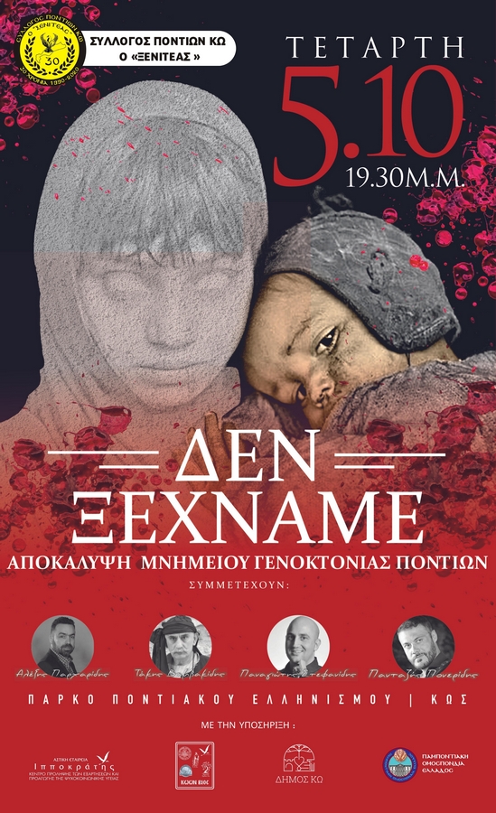 Ο Πρόεδρος και τα Μέλη του Δ.Σ. του Συλλόγου Ποντίων Κω, ο  «Ξενιτέας », σας προσκαλούν στην Αποκάλυψη του Μνημείου της Γενοκτονίας των Ελλήνων του Πόντου στην πόλη της Κω και συγκεκριμένα στο Πάρκο Ποντιακού Ελληνισμού.