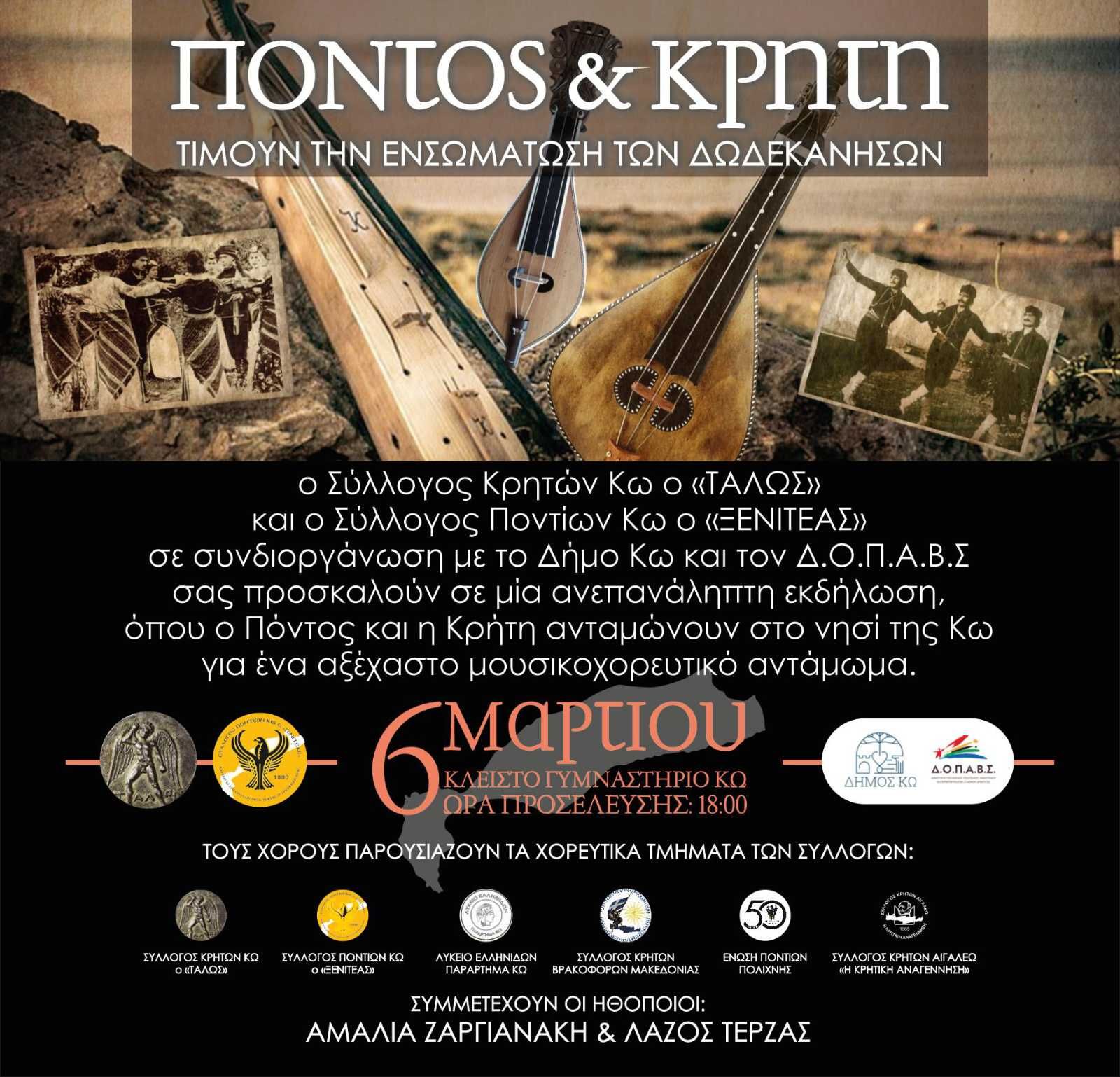 Ποντίων Κω «ο Ξενιτέας» και με την υποστήριξη του Δ.Ο.Π.Α.Β.Σ. Δήμου Κω, διοργανώνουν μία μεγάλη, ανεπανάληπτη, κοινή μουσικοχορευτική παράσταση στις 6 Μαρτίου 2023, στο Κλειστό Γυμναστήριο της πόλης, με τίτλο «Πόντος και Κρήτη τιμούν την ενσωμάτωση των Δωδεκανήσων», ενώ στις 7 Μαρτίου, Πόντιοι και Κρητικοί συμμετέχουν με μικτό τμήμα στην δοξολογία, κατάθεση στεφάνων και στην παρέλαση στα πλαίσια των τοπικών