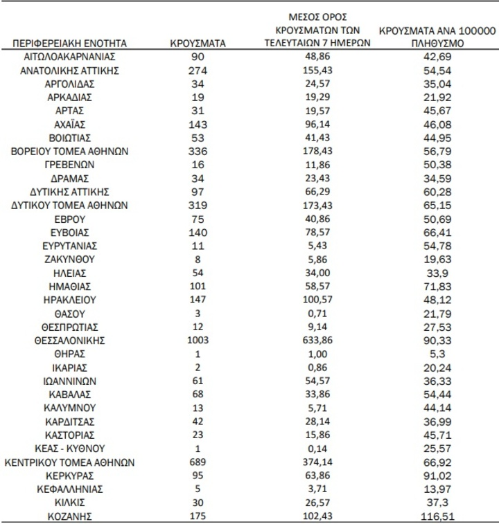 Με βάση τα επιβεβαιωμένα κρούσματα των τελευταίων 7 ημερών, 211 θεωρούνται σχετιζόμενα με ταξίδι από το εξωτερικό και 2.905 είναι σχετιζόμενα με ήδη γνωστό κρούσμα.