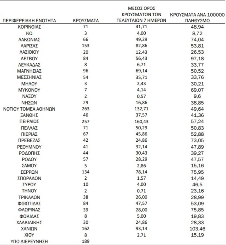 Γεωγραφική διασπορά: Ο χάρτης αποτυπώνει τη γεωγραφική κατανομή των συνολικών κρουσμάτων COVID-19 (από την αρχή της επιδημίας) ανά Περιφερειακή Ενότητα της χώρας, με βάση την δηλωθείσα διεύθυνση μόνιμης κατοικίας του ασθενούς, ή τη διεύθυνση προσωρινής διαμονής για τους τουρίστες και άλλους προσωρινά διαμένοντες στην Ελλάδα. Συμπεριλαμβάνονται τόσο κρούσματα με ιστορικό ταξιδίου (“εισαγόμενα”) όσο και κρούσματα με πιθανή εγχώρια μετάδοση.