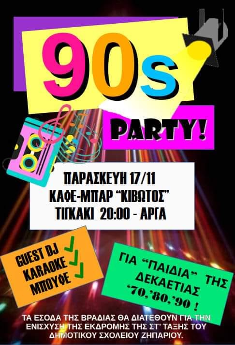 90's Party ΑΥΤΗΝ ΤΗΝ ΠΑΡΑΣΚΕΥΗ 17/11 ΩΡΑ 20:00 ΣΤΗΝ ΚΙΒΩΤΟ (ΤΙΓΚΑΚΙ)▪︎ Μουσική▪︎ Ποτά▪︎ Μπουφές▪︎ ΚαραόκεΓΙΑ ΤΗΝ ΕΝΙΣΧΥΣΗ ΤΗΣ ΕΚΔΡΟΜΗΣ ΤΗΣ ΣΤ ΤΑΞΗΣ ΤΟΥ @ΔΗΜΟΤΙΚΟΥ ΣΧΟΛΕΙΟΥ ΖΗΠΑΡΙΟΥ