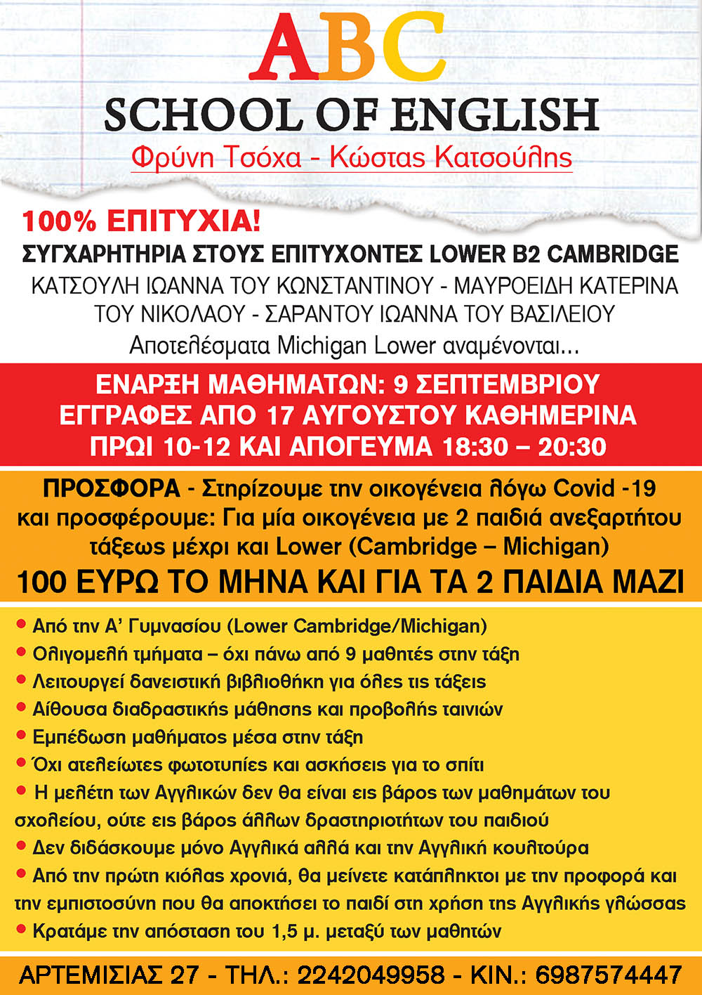 ABC SCHOOL OF ENGLISH ΦΡΥΝΗ ΤΣΟΧΑ – ΚΩΣΤΑΣ ΚΑΤΣΟΥΛΗΣ: ΕΝΑΡΞΗ ΜΑΘΗΜΑΤΩΝ 9 ΣΕΠΤΕΜΒΡΙΟΥ