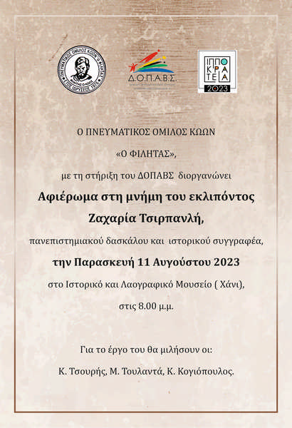 Αφιέρωμα στη μνήμη του εκλιπόντος Ζαχαρία Τσιρπανλή πανεπιστημιακού δασκάλου και ιστορικού συγγραφέα διοργανώνει ο Πνευματικός Όμιλος Κώων Ο Φιλητάς με τη στήριξη του ΔΟΠΑΒΣ στα Θερινά Ιπποκράτεια 2023 την Παρασκευή 11 Αυγούστου στο Ιστορικό και Λαογραφικό Μουσείο Κω ( Χάνι) στις 8 το βράδυ.