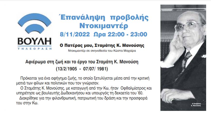 Αφιέρωμα στη ζωή και το έργο του Σταµάτη Κ. Μανούση στις 8/11 στο Κανάλι της Βουλής