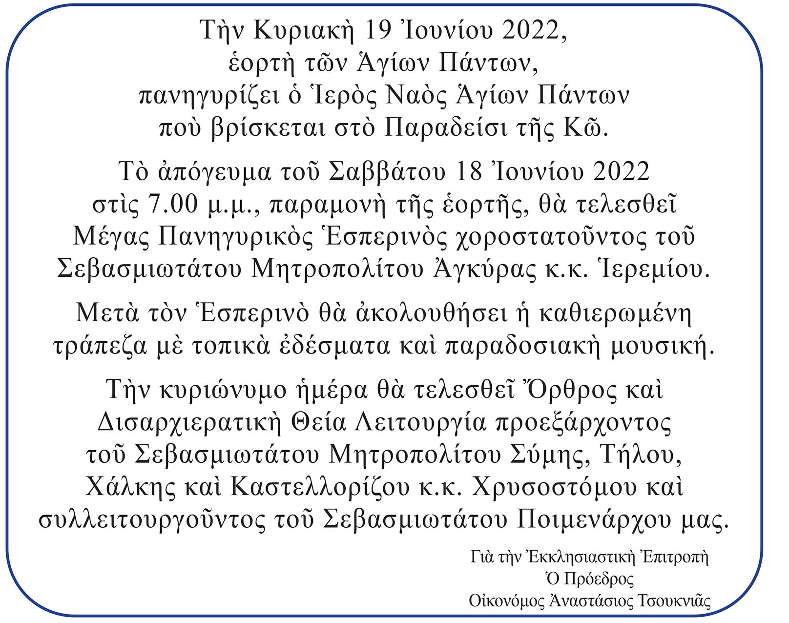ΑΝΑΚΟΙΝΩΣΗ - ΠΡΟΣΚΛΗΣΗ ΠΑΝΗΓΥΡΕΩΣ Ι.Ν. ΑΓΙΩΝ ΠΑΝΤΩΝ ΠΑΡΑΔΕΙΣΙΟΥ ΚΩ
