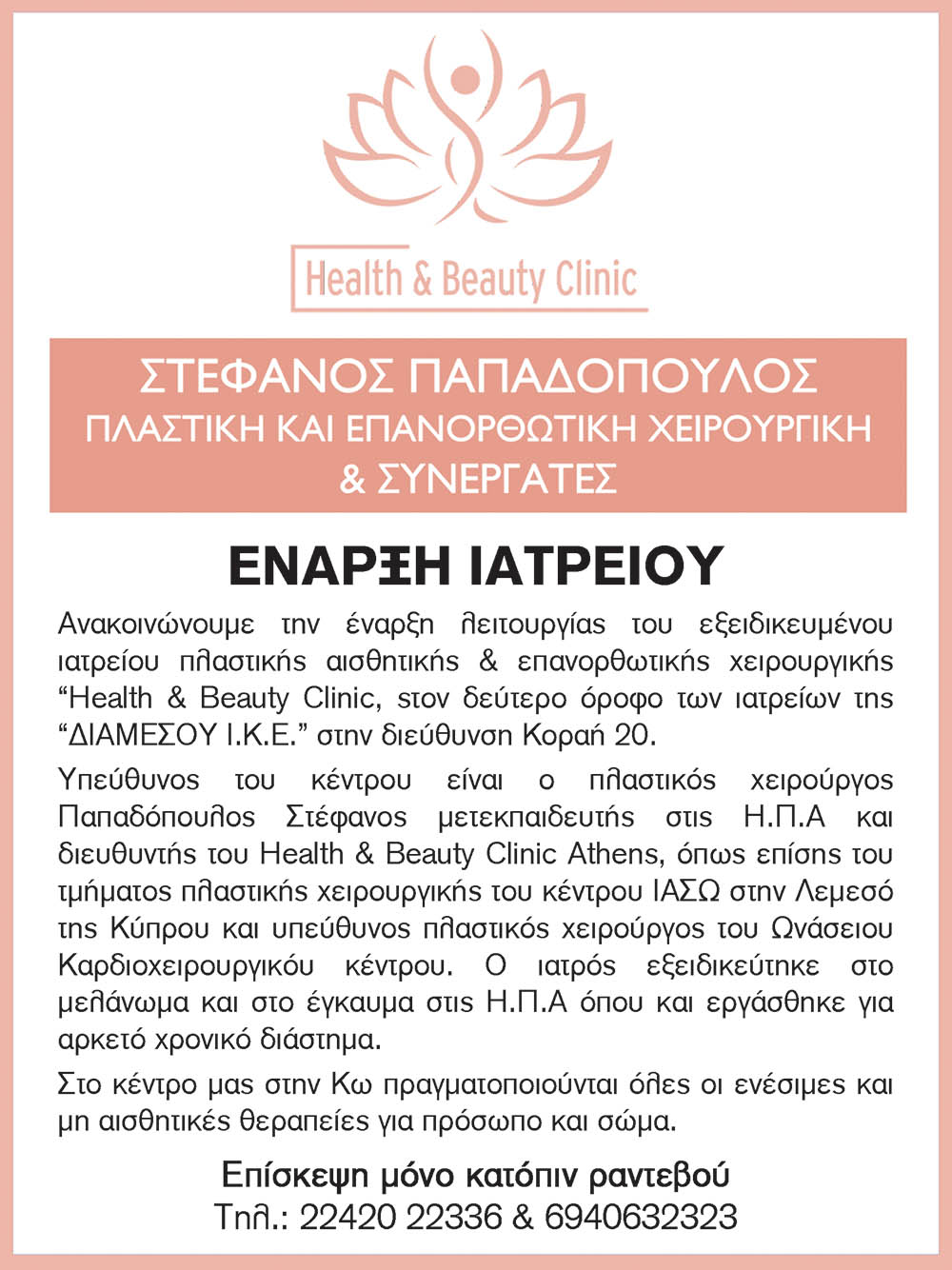 Ανακοινώνουμε την έναρξη λειτουργίας του εξειδικευμένου ιατρείου πλαστικής αισθητικής & επανορθωτικής χειρουργικής “Health & Beauty Clinic.