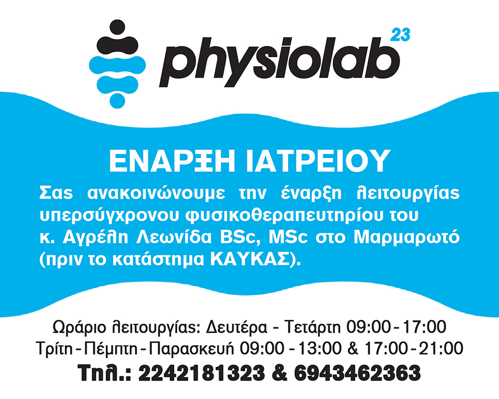 Ανακοίνωση έναρξης λειτουργίας του υπερσύγχρονου φυσικοθεραπευτηρίου του κ. Αγρέλη Λεωνίδα BSc, MSc στο Μαρμαρωτό