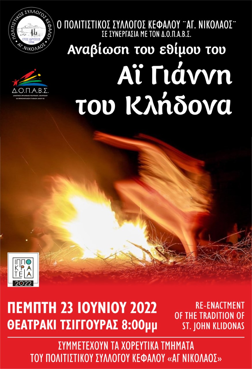 Ο Πολιτιστικός Σύλλογος Κεφάλου «Άγιος Νικόλαος» με την στήριξη του ΔΟΠΑΒΣ παρουσιάζει την Αναβίωση του Εθίμου του Φανού και του Κλήδονα την Πέμπτη 23 Ιουνίου 2022 και ώρα 20:00 στο Θεατράκι της Τσιγγούρας στην Κέφαλο.
