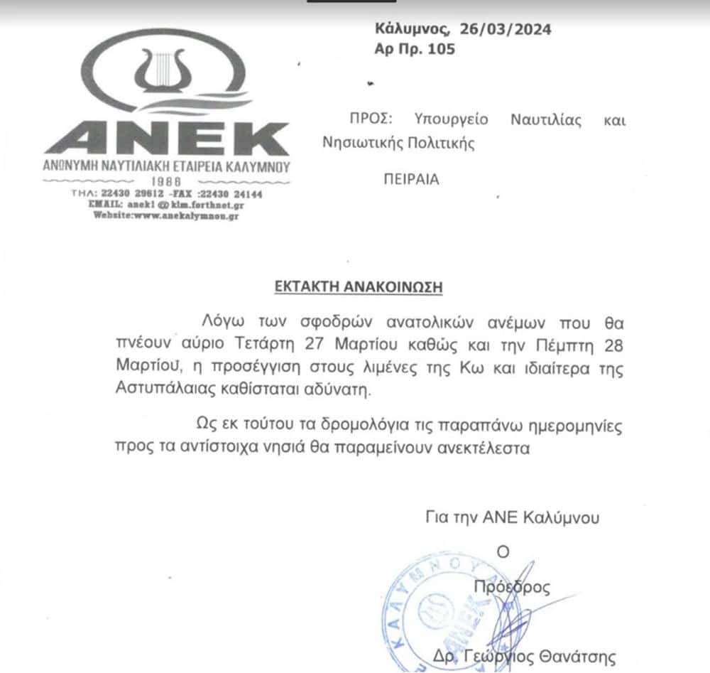 Ανεκτέλεστα τα δρομολόγια προς Κω-Αστυπάλαια του “Ν.ΚΑΛΥΜΝΟΣ” στις 27 και 28 Μαρτίου 2024 λόγω δυσμενών καιρικών συνθηκών.