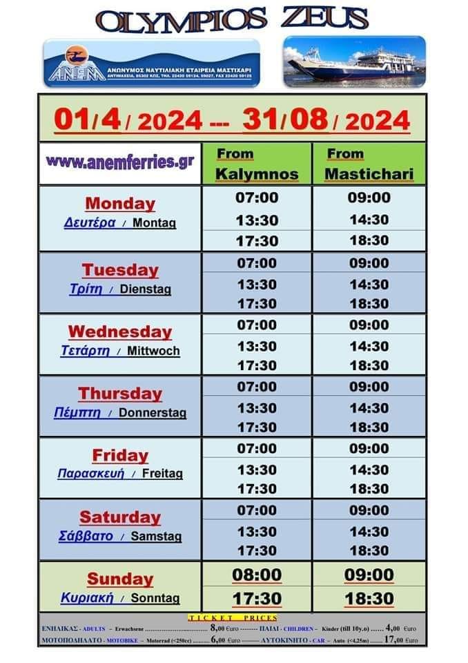 ΑΝΕΜ: Τα δρομολόγια του "Olympios Zeus" στη γραμμή Μαστιχάρι - Κάλυμνος από 1/4 - 31/8