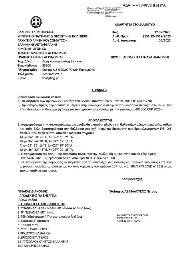 ΑΠΑΓΟΡΕΥΣΗ ΚΥΚΛΟΦΟΡΙΑΣ ΣΚΑΦΩΝ ΣΤΙΣ 24/7 ΚΑΤΑ ΤΗΝ ΔΙΑΡΚΕΙΑ ΑΓΩΝΩΝ ''RODOS CUP 2023''