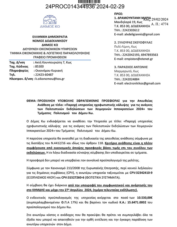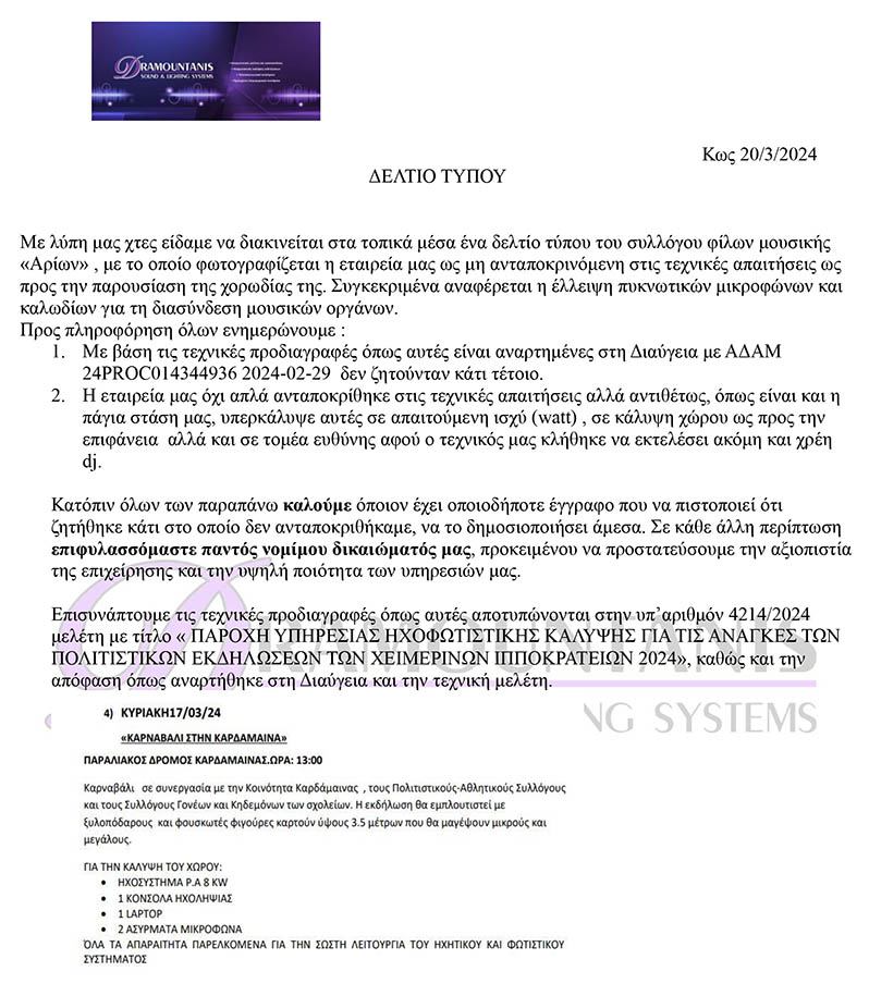 Απάντηση της εταιρείας στο Σ/γο "Αρίων" για την ηχητική κάλυψη του Καρναβαλιού Καρδάμαινας