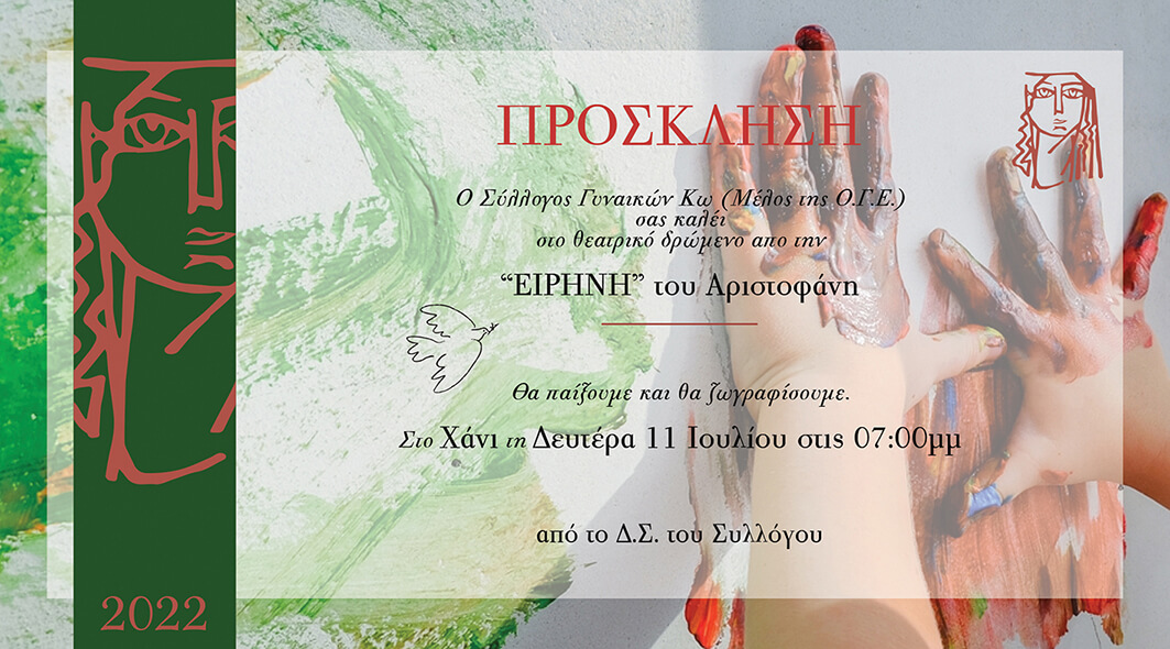 Ο Σύλλογος Γυναικών Κω (Ο.Γ.Ε) σας καλεί σ’ ένα απόγευμα δημιουργικής απασχόλησης με παιδικό θεατρικό δρώμενο. Στέλνουμε μαζί με τα παιδιά μας το μήνυμα ότι είμαστε αντίθετοι σε κάθε άδικο πόλεμο, προστατεύουμε την ειρήνη και η «δράση» μας έχει μεγάλη σημασία για την ζωή και το μέλλον όλων μας.