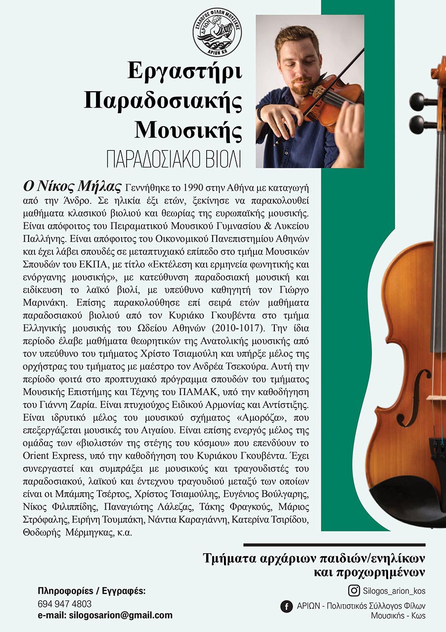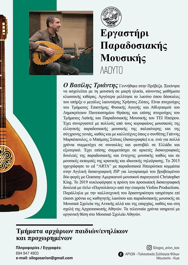 Το Εργαστήρι Παραδοσιακής Μουσικής του Συλλόγου Φίλων Μουσικής "ΑΡΙΩΝ" προσκαλεί σπουδαίους καλλιτέχνες στην Κω με στόχο τη διδασκαλία, διάδοση και εξέλιξη της παραδοσιακής μουσικής του τόπου μας.
