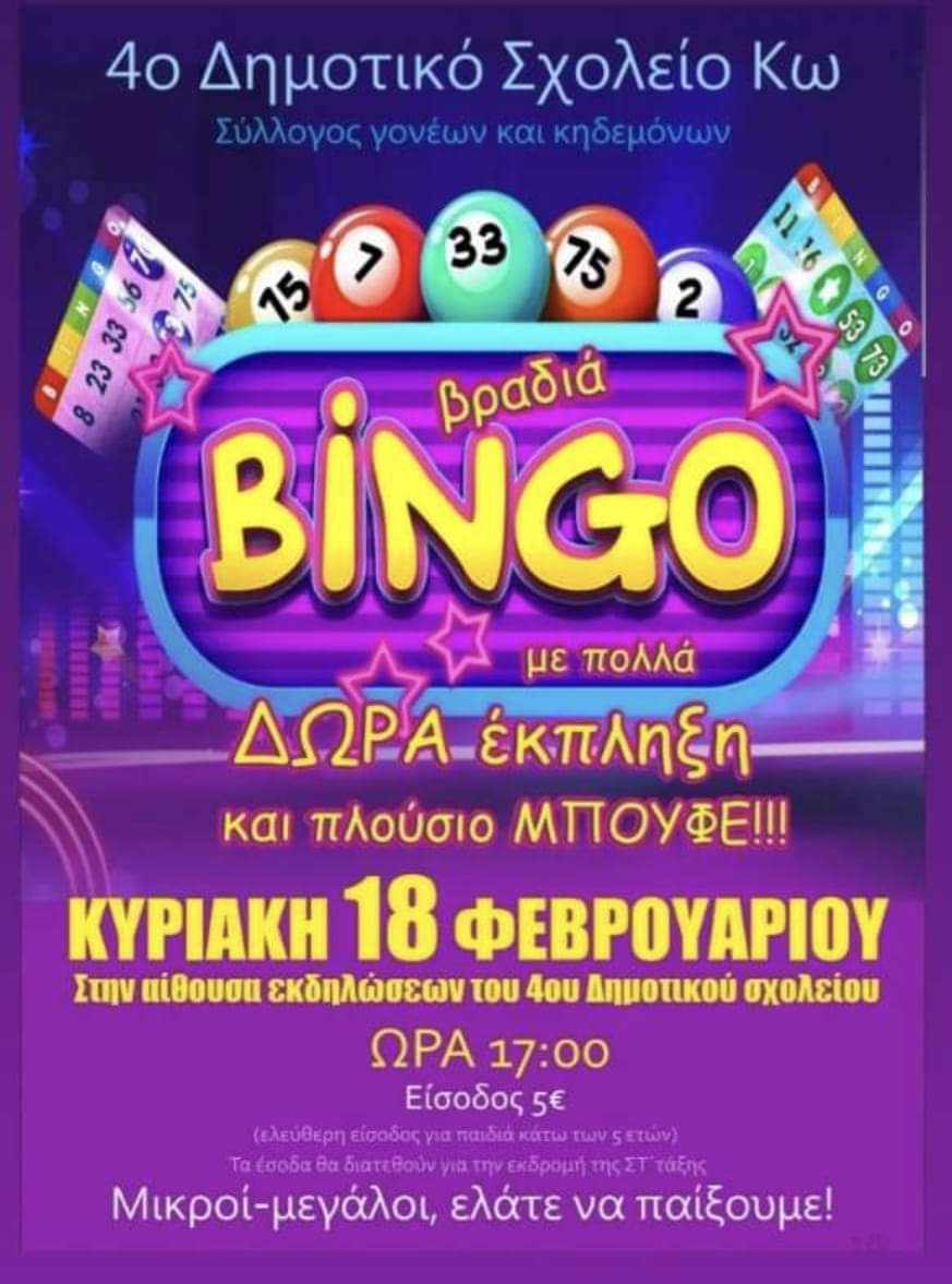 Bingo από το 4ο Δημοτικό Σχολείο Κω, την Κυριακή 18/2