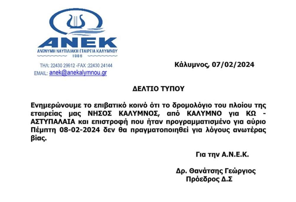 Με ανακοίνωση της, η ΑΝΕ Καλύμνου κάνει γνωστό στο επιβατικό κοινό ότι το δρομολόγιο του πλοίου της εταιρείας ΝΗΣΟΣ ΚΑΛΥΜΝΟΣ, από ΚΑΛΥΜΝΟ για ΚΩ και ΑΣΤΥΠΑΛΑΙΑ και επιστροφή που ήταν προγραμματισμένο για αύριο Πέμπτη 08-02-2024 δεν θα πραγματοποιηθεί για λόγους ανωτέρας βίας.