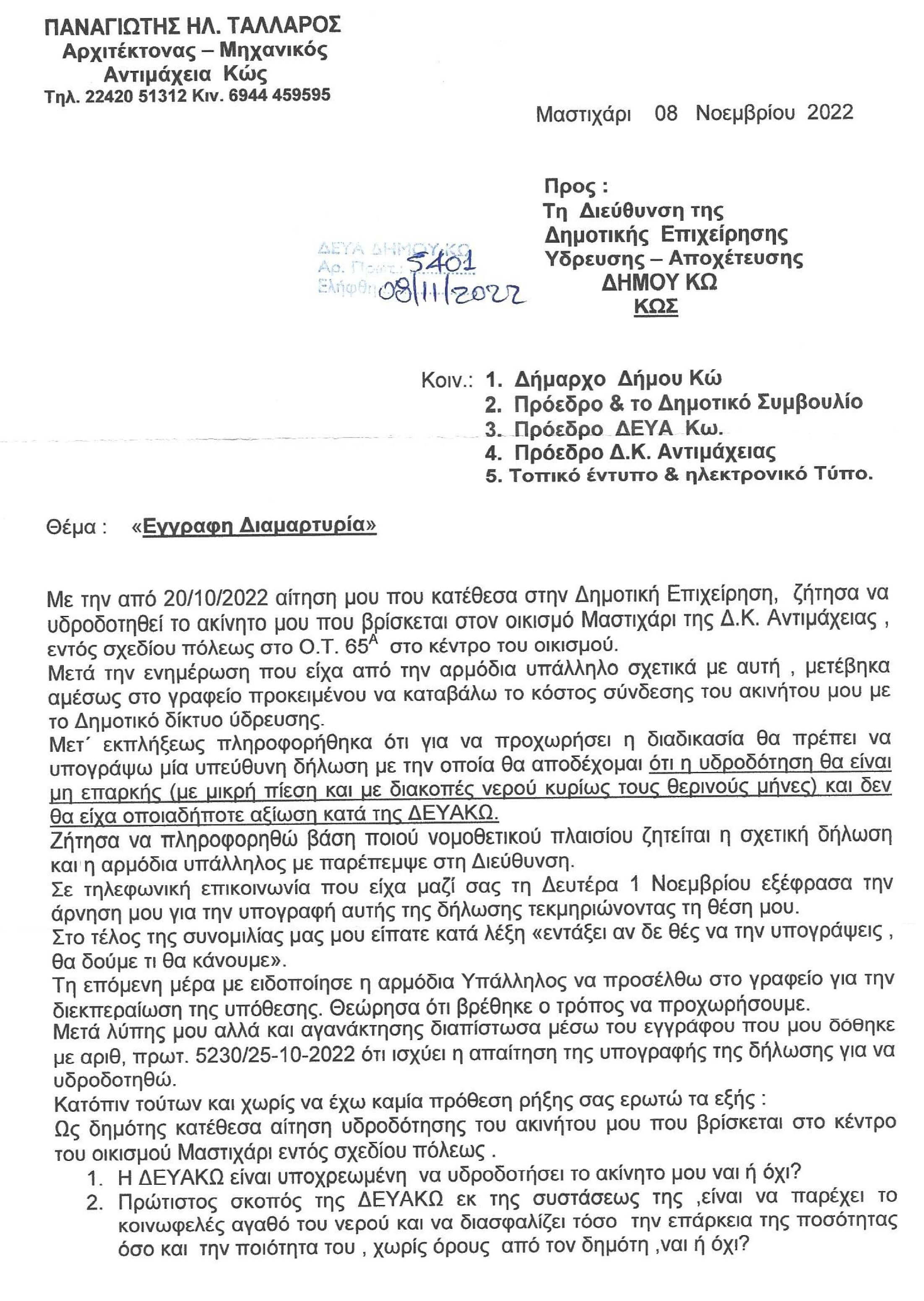 Με επιστολή του ο κ. Παναγιώτης Τάλλαρος, αρχιτέκτονας από το Μαστιχάρι, διαμαρτύρεται για την μη υδροδότηση του ακινήτου του, κατηγορώντας την ΔΕΥΑΚ για τακτικές εκβιασμού.