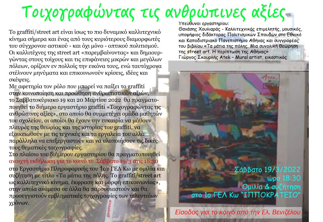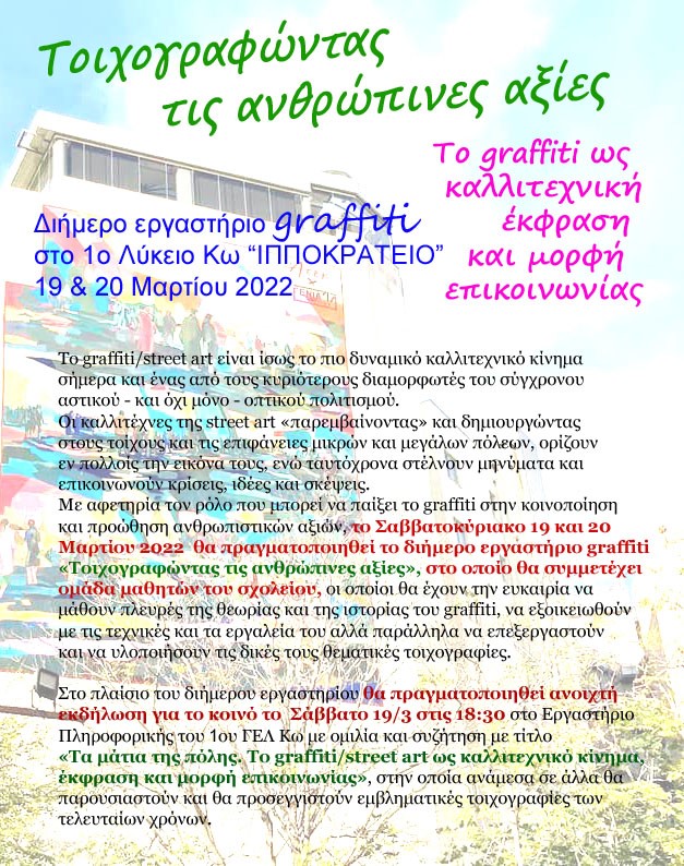 Διήμερο Εργαστήριο για το GRAFFITI με τον γενικό τίτλο «Τοιχογραφώντας τις ανθρώπινες αξίες» διοργανώνεται στο 1ο ΓΕΛ Κω «ΙΠΠΟΚΡΑΤΕΙΟ» το Σάββατο 19 και την Κυριακή 20 Μαρτίου 2022.