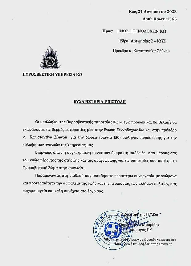 Ευχαριστώ και εγώ με τη σειρά μου τον Διοικητή κ. Γρηγόρη Μαυρίδη και όλους τους πυροσβέστες του νησιού μας, όπως και τα μέλη της Ένωσης Ξενοδόχων που πάντα ανταποκρίνονται στα αιτήματά μας.
