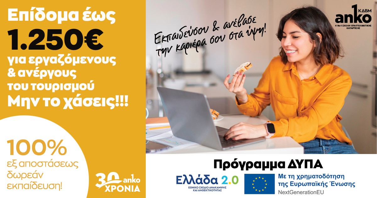 Το Κέντρο Δια Βίου Μάθησης Anko θα συμμετέχει στο καινοτόμο πρόγραμμα κατάρτισης που αναμένεται από τη Δημόσια Υπηρεσία Απασχόλησης (ΔΥΠΑ). Το δωρεάν πρόγραμμα που θα υλοποιηθεί εξ αποστάσεως, σχεδιάστηκε για να ενισχύσει τόσο τους απασχολούμενους όσο και τους ανέργους, προσφέροντας ένα ολοκληρωμένο πρόγραμμα προσαρμοσμένο στις δυναμικές ανάγκες του τομέα του τουρισμού.