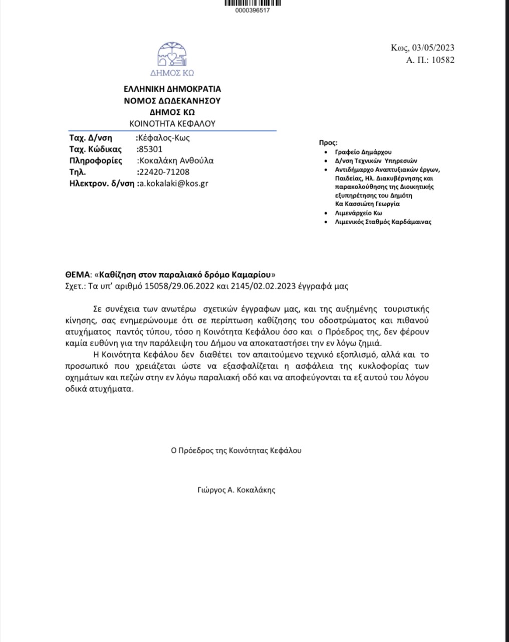 Εγγράφως, με τρεις επιστολές του, στις 29.6.22- 2.2.23 και 3.5.23, ο Πρόεδρος της Κεφάλου Γιώργος Κοκαλάκης επισημαίνει το πρόβλημα στον παραλιακό του Καμαρίου.
